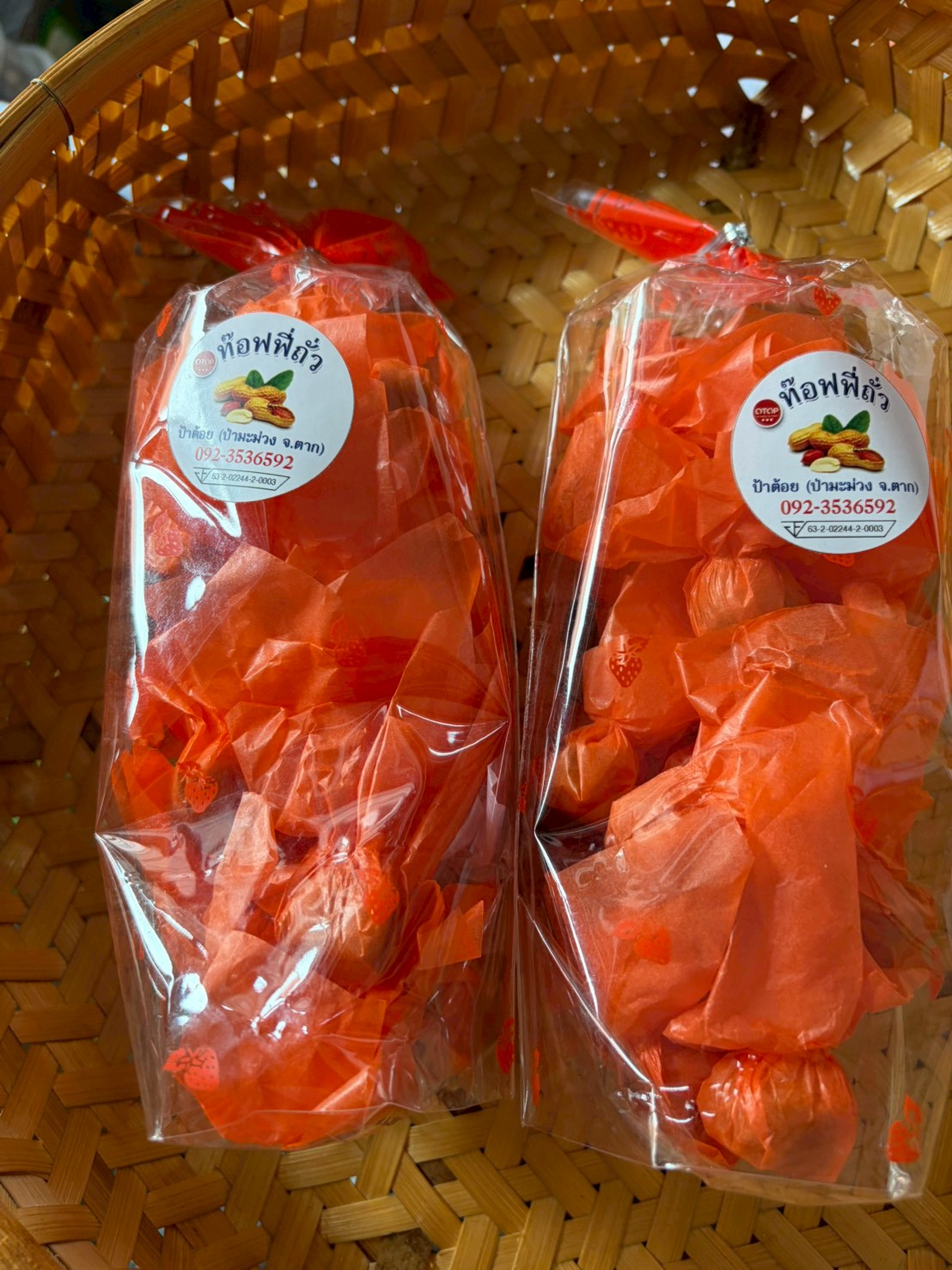 ไปที่ร้านค้าเอกลักษณ์ท๊อฟฟี่กะทิถั่ว เป็นสูตรชาววังที่ได้ถ่ายทอดจากรุ่นยายสู่รุ่นลูกและหลาน สืบทอดกันมาจน กระทั่งปัจจุบัน ยังคงรักษาสูตรดั้งเดิมไว้ ไม่มีสารกันบูด ไม่เหนียวติดฟันเวลารับประทานทำให้เพลิดเพลินจนไม่รู้สึกตัวจนกระทั่งหมด มีการห่อ 2 ชั้น
