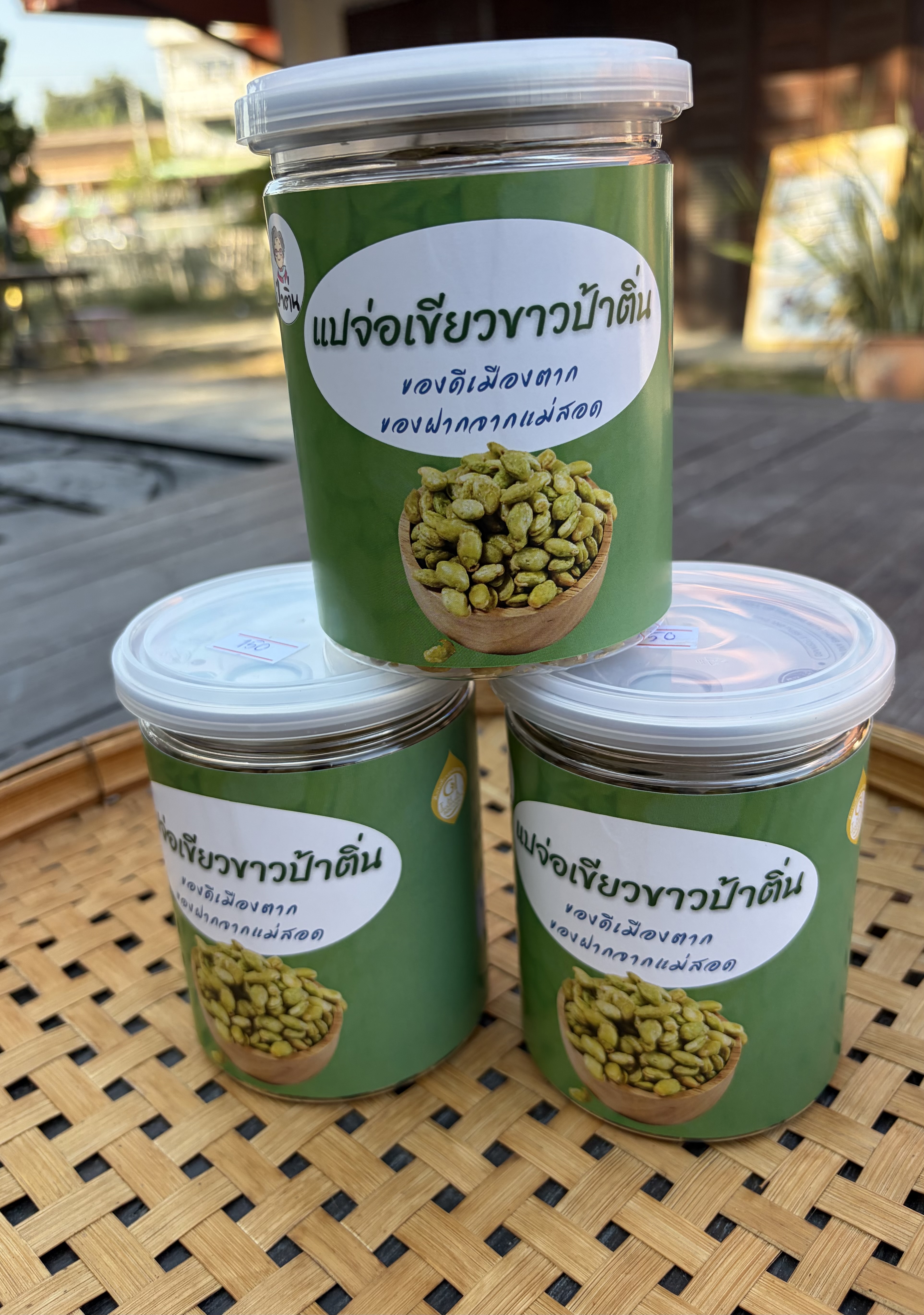ไปที่ร้านค้าแปจ่อเขียวขาวป้าติ่นแม่สอด(แบบกระปุก) ถั่วทอดที่ทำมาจากถั่วแปจี มีลักษณะคล้ายถั่วแปบ